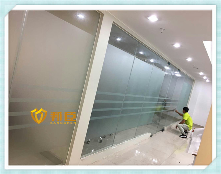 案例说明:办公室做玻璃隔断是现在办公室的必备,但是透明的玻璃又太通透,无论例外都一览无余,影响正常工作,所以公司采购部找到邦臣窗膜,为公司做了玻璃装饰的方案