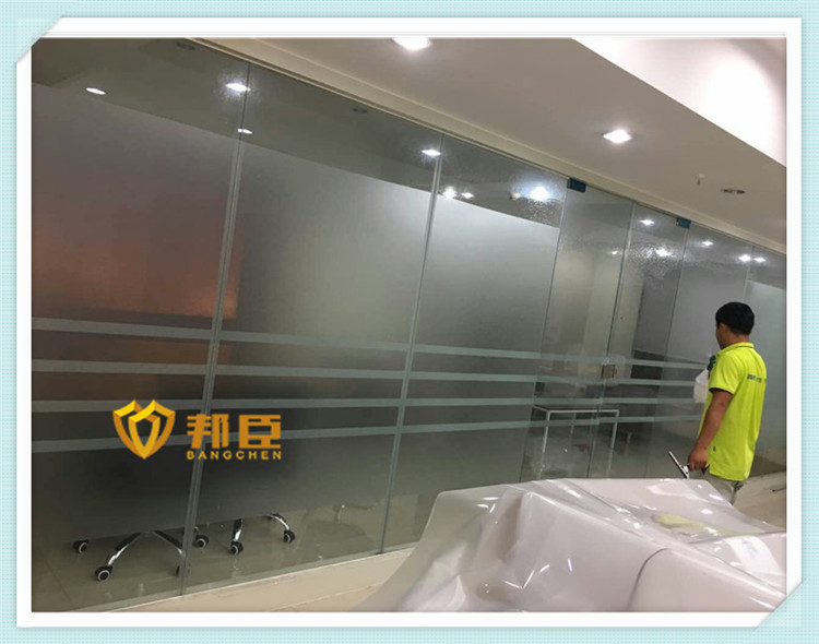 案例说明:办公室做玻璃隔断是现在办公室的必备,但是透明的玻璃又太通透,无论例外都一览无余,影响正常工作,所以公司采购部找到邦臣窗膜,为公司做了玻璃装饰的方案